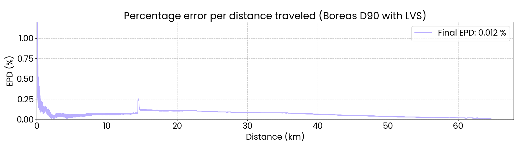 When paired with a wheel speed encoder, Boreas D90 delivered reliable dead-reckoning performance ideal for platforms operating in predictable or structured environments. Across the demonstration, the Boreas D90–wheel encoder configuration maintained strong navigation continuity, achieving a 0.018% error per distance traveled (11.7 m over 65 km), without reliance on GNSS, even under deliberate jamming.